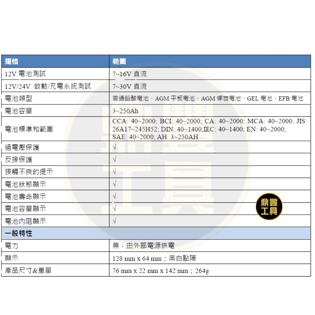 可用於分析汽車電池的電池健康狀況,適用於30Ah至200Ah的電池容量。 通過 CE 認證的測試儀可以快速準確地檢測出由電池引起的常見故障。 認證:CE,UKCA,FCC ● 12V起動鉛酸電池測試 ● 語言選項(中文/英文) ● 12/24V充電或啟動系統測試 ● 不拆電池測試 ● 四端開爾文測試 ● 10種電池標準 ● 測試結果的LED顏色指示(UT673A) ● 顯示電池容量、電壓、內阻和壽命